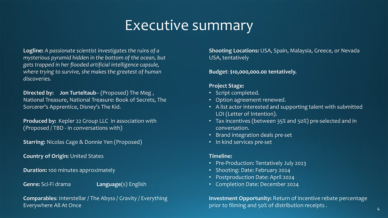 Produced by: Kepler 22 Group LLC in association with (Proposed / TBD - in conversations with)